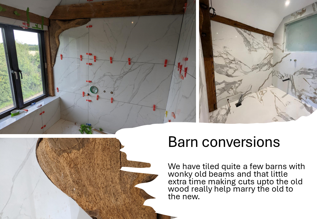 If you are looking to have wall or floor tiling in your barn conversion we have experience with limestone and slate, or the more modern styles like XL concrete effect tiles or XL porcelain which we have cut perfectly into 200 year old beams.